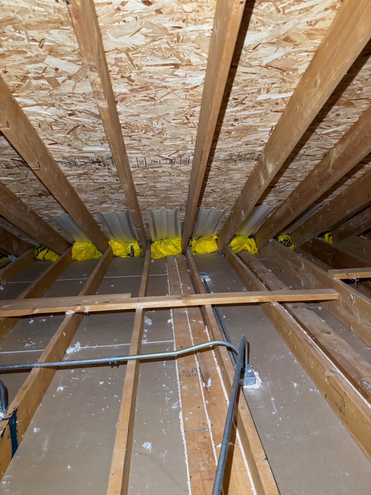Placing ventilation channels in the attic to ensure that airflow from the soffits is not blocked by insulation, maintaining proper roof ventilation.