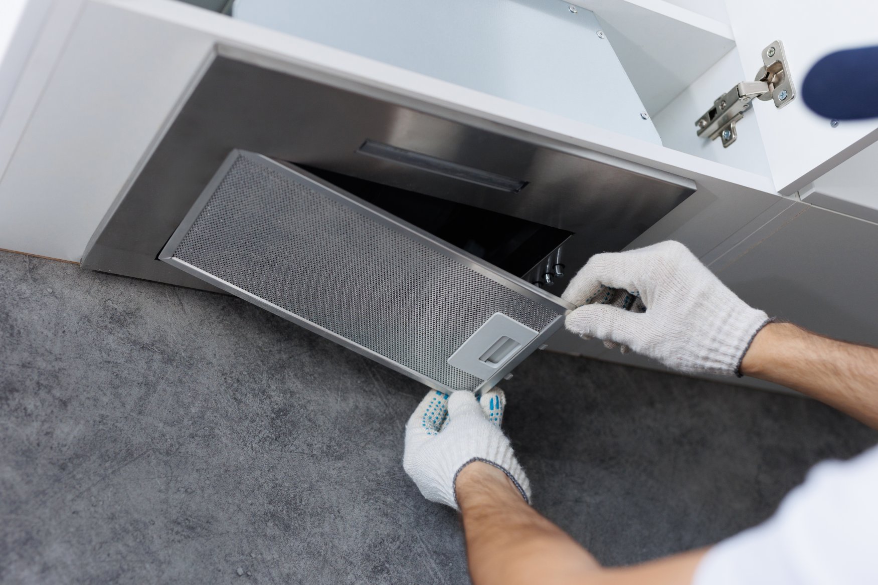Mounting of kitchen range hoods and exhaust fans to ventilate smoke, grease, and odors, ensuring a clean and safe cooking environment.